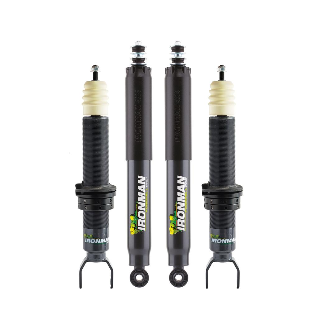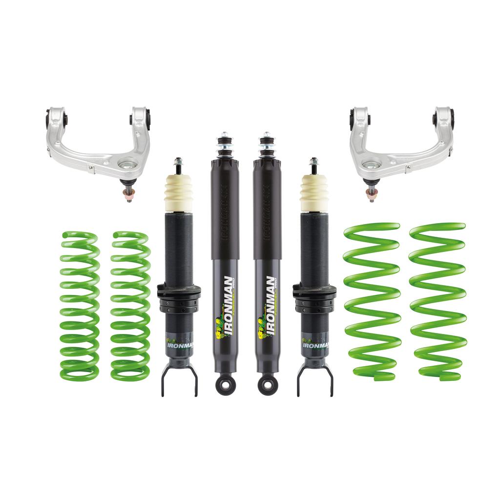 Los kits completos de suspensión Ironman 4x4 incluyen amortiguadores delanteros y traseros, junto con espirales reforzados (y/o ballestas según modelo), diseñados para elevar tu vehículo en torno a 2” y mejorar tanto el confort como el rendimiento en terrenos exigentes.